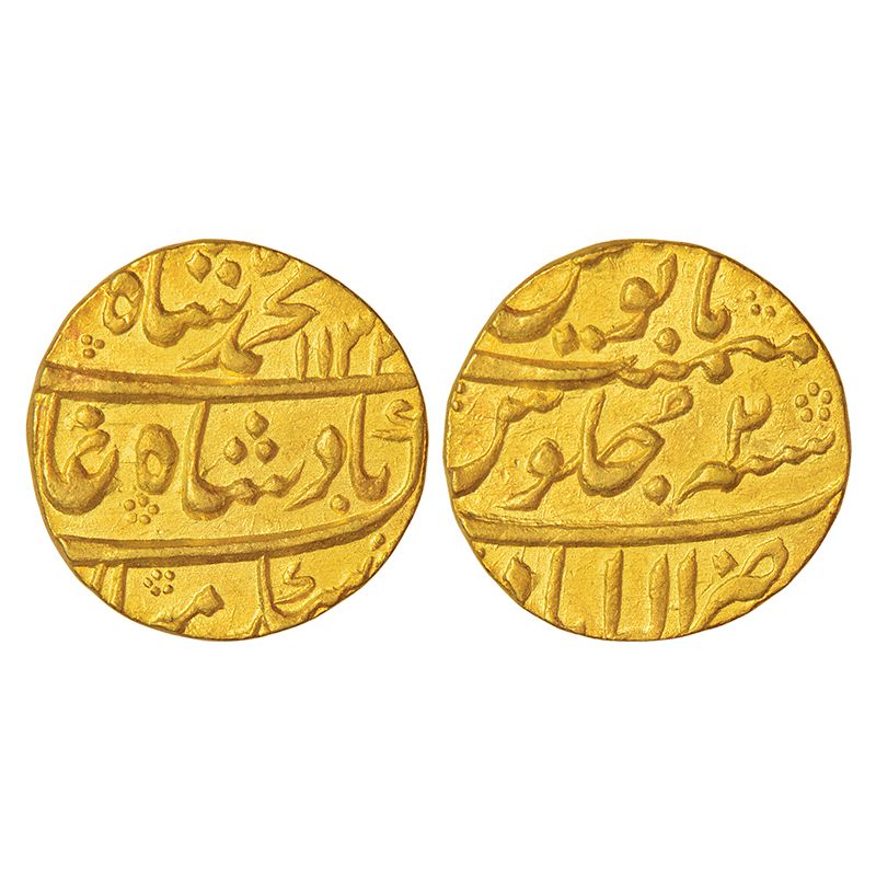 Muhammad Shah (1719-1748 AD), gold mohur, Allahabad mint, AH 1132/RY 2, KM 438.3 (unlisted date), 10.89g. Obv: Persian legend Sikka Mubarak Badshah Ghazi Muhammad Shah (the auspicious coin of the victorious Emperor Muḥammad Shah) with AH date. Rev: Mint name, RY and Jalus formula.