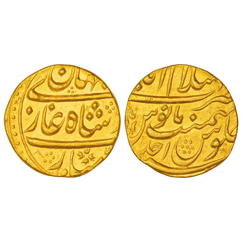 Shah Jahan III (1759-1760 AD), gold mohur, Islamabad mint at top, AH-/RY Ahd, not listed in major publications, 10.89g. Obv: Persian legend Sikka Mubarak Badshah Ghazi Shah Jahan. Rev: Mint-name, RY and Jalus formula.