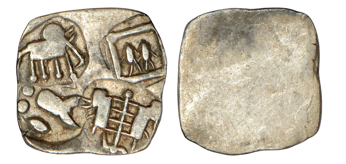 Archaic Silver punch marked coin - Wainganga-Mahanadi Divide, Umred hoard type, sometimes attributed to 'Vidarbha Janapada', (c.300-200 BC), light ½ Karshapana standard, 1.11g. Obv: four marks in ABCD configuration - 1x elephant facing right, 1x a bold Taurine with dots, 1x a pair of oxen yoked to a plough and 1x two fishes in a rectangle.