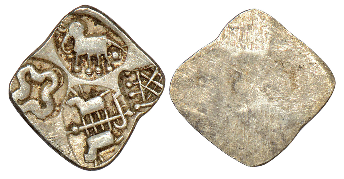 Archaic Silver punch marked coin - Wainganga-Mahanadi Divide, Umred hoard type, sometimes attributed to 'Vidarbha Janapada', (c.300-200 BC), light ½ Karshapana standard, 1.16g. Obv: four marks in ABCD configuration - 1x elephant facing left, 1x open cross, 1x a pair of oxen yoked to a plough and 1x granary / basket with four prongs.