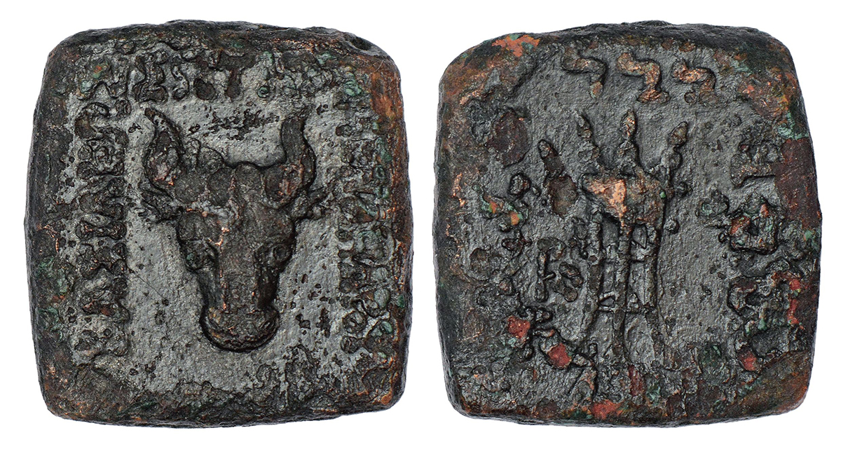 Indo-Greeks, copper octuple obol of Menander I (c.155-130 BC), 19.98g. Obv: Head of bull facing, Greek legend BASILEOS SOTEROS MENANDROU (King Menander, the Saviour) around. Rev: Tripod with monogram in lower left field, Kharoshthi legend maharajasa tratarasa menandrasa around.