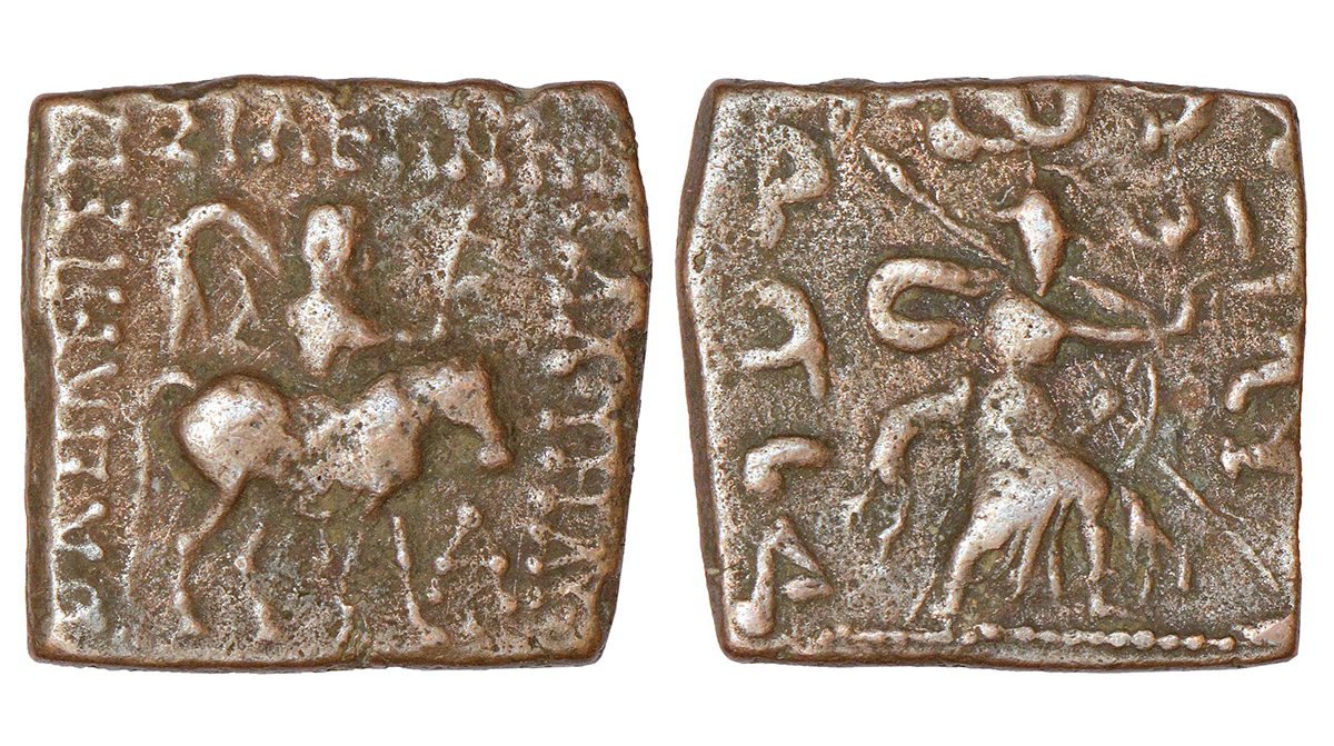 Indo-Scythians - bronze unit of Maues (c.90-57 BC), ISCH 22.1, 8.07g. Obv: Maues on horseback to right, holding elephant goad; to right, monogram 'A'; Greek legend BASILEOS BASILEON MEGALOU MAUOU around. Rev: Athena advancing to right, holding spear and shield in her left hand and making gesture of benediction with her right hand; Kharoshthi legend Rajadirajasa mahatasa Moasa around.