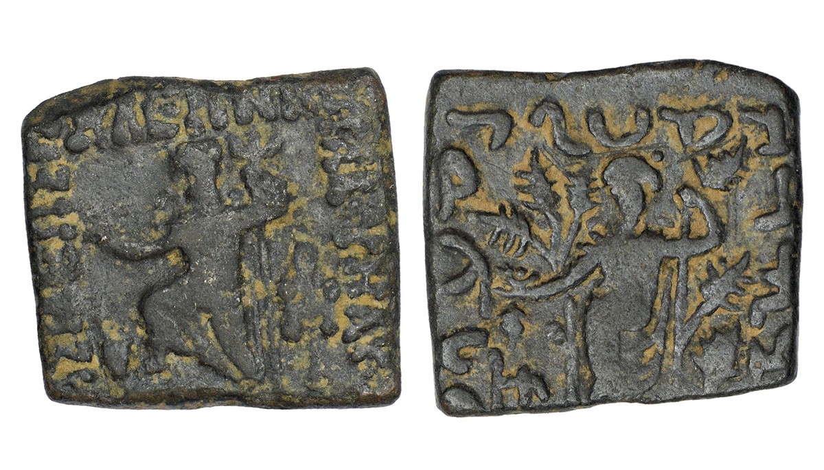 Indo-Scythians, Azes (45-20 BC), square copper unit, similar to ISCH 77.2, 8.32g. Obv: Poseidon, resting foot on river god, standing facing, holding trident; Greek legend BASILEOS BASILEON MEGALOU AZOU around, monogram to right. Rev: Yakshi standing facing, emerging out of Pipal tree, holding vines; Kharoshthi legend maharajasa rajadirajasa mahatasa ayasa around, monogram to lower left.