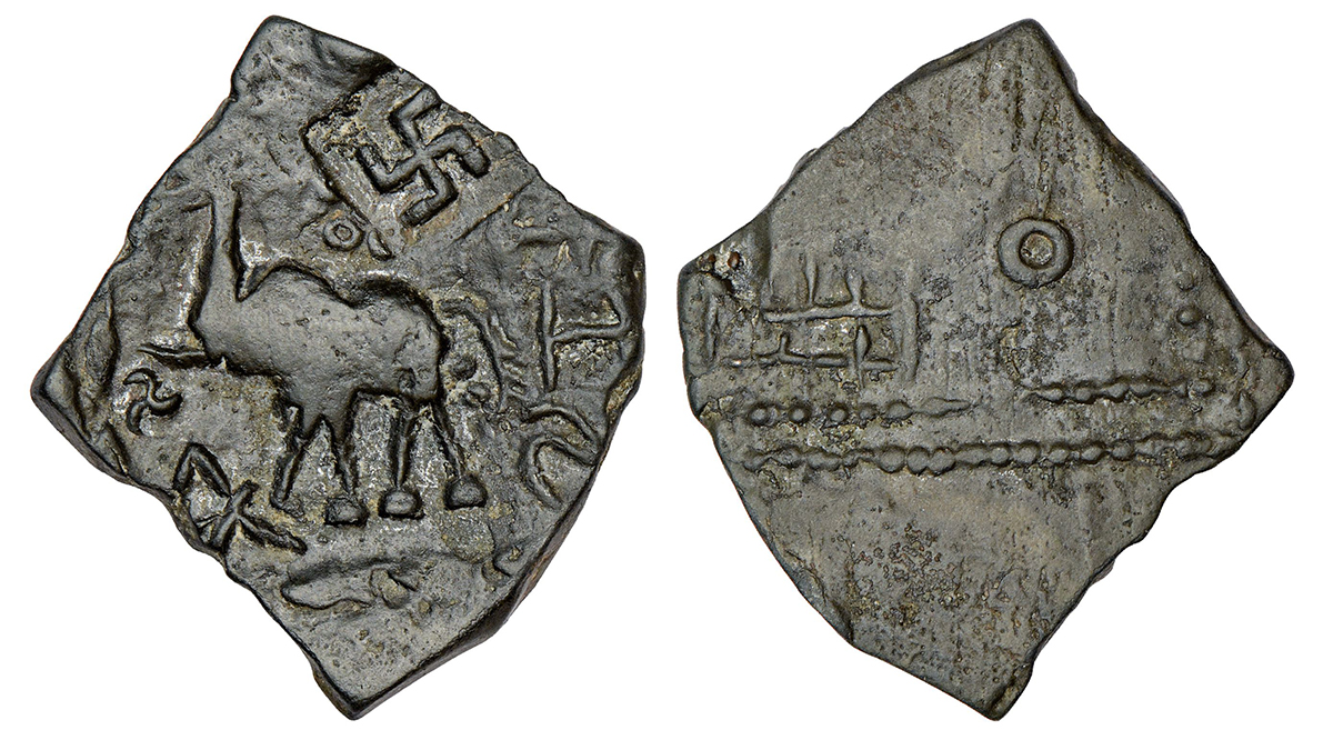 Satavahanas - Siri Satakani (100-50 BC), alloyed copper 'elephant' type coin from Nasik region, 9.82g. Obv: elephant walking to left, triangle-headed standard placed horizontally in front; Brahmi legend ...kanisa to right; countermarked with a Swastika symbol. Rev: Within a double dotted rectangular border, a tree in railing and a modified 'Ujjain' symbol placed besides each other.