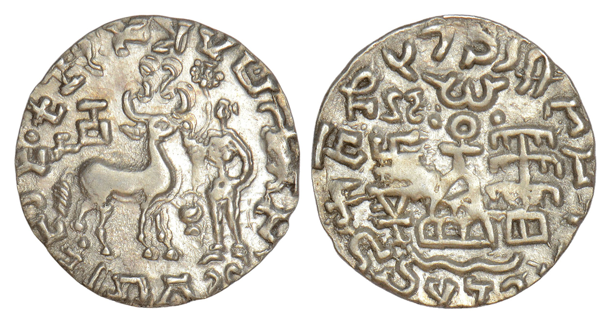 Post-Mauryan tribal monarchies, Kunindas, silver drachm of Amoghabhuti (50 BC-50 AD), similar to Pieper 1195, 2.13g. Obv: Goddess standing holding lotus, a deer to her left, Shrivatsa between horns and altar above rump, Kalasha symbol (Pot) between the goddess and the deer; Brahmi legend Rajño Kunindasya Amoghabhutisya Maharajasya around. Rev: Composite symbol of six-arched hill, wavy line, Nandipada, Swastika, Shrivatsa, triangle-headed standard and tree-in railing; Kharoshthi legend Raña Kunidasa Amoghabhutisa Maharajasa around.