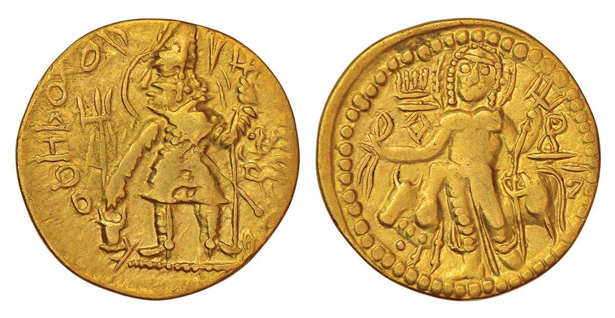 Kidarites - gold dinar imitating designs of Kushan king Vasudeva II (c.300-350 AD), 7.74g. Obv: Nimbate king wearing conical helmet and armour, standing holding a trident, offering sacrifice at an altar with trident standard and pennants in the backdrop; Bactrian legend around. Rev: Nimbate Shiva/Oesho, standing reclining on Nandi; Bactrian legend OEShO to right and tamgha to left.