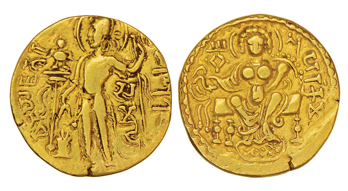 Gupta Empire, gold dinar of Samudra Gupta (350-375 AD), 'Standard/Javelin' type, S. Kumar Class II, var. A.6, 7.38g. Obv: Nimbate and armoured king, wearing tunic, standing and holding a standard, offering sacrifice at an altar, with a Garuda standard in the backdrop; Brahmi legend Samudra below the king's flexed arm; Brahmi legend Samarashatavitatavijayo jitaripurajito divam jayati visible in parts along the margin. Rev: Nimbate Goddess Lakshmi, enthroned facing, holding a noose in her outstretched arm and a cornucopia in her other hand, with her feet placed on a dotted footrest; Brahmi legend Parakramah in the right field, a Tamgha in the left field, dotted border around.