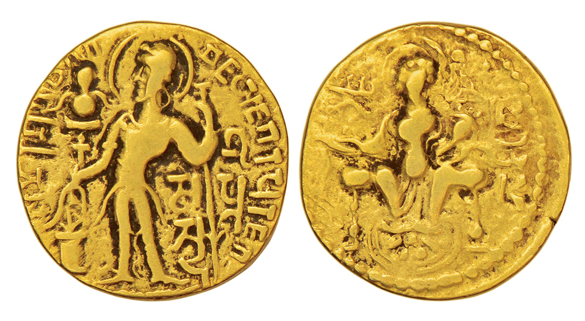 Gupta Empire, gold dinar of Samudra Gupta (350-375 AD), 'Standard/Javelin' type, S. Kumar Class II, var. E, 7.43g. Obv: Nimbate and armoured king, wearing tunic, standing and holding a standard, offering sacrifice at an altar, with a Garuda standard in the backdrop; Brahmi legend Samudra Gupta in two vertical lines below the king's flexed arm; Brahmi legend Samarashatavitatavijayo jitaripurajito divam jayati visible in parts starting from 8 o'clock along the margin. Rev: Nimbate Goddess Lakshmi, enthroned facing, holding a noose in her outstretched arm and a cornucopia in her other hand, with her feet placed on a dotted footrest; Brahmi legend Parakramah in the right field, a Tamgha in the left field, dotted border around.