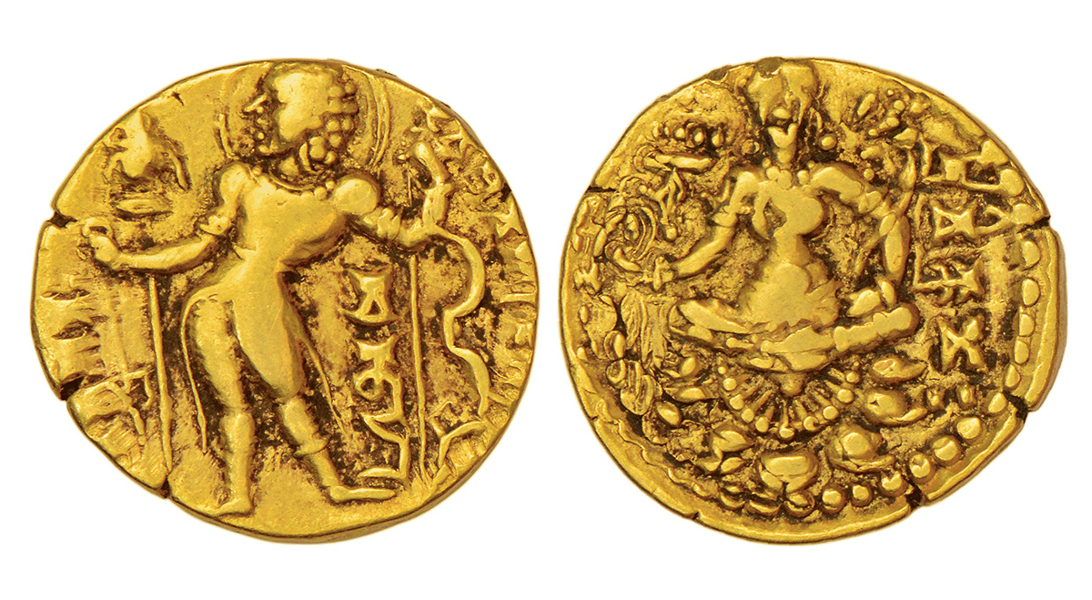 Gupta Empire - gold dinar of Chandragupta II (c.375-415 AD), 'Archer-Goddess on Lotus' type, S. Kumar Class III, var. A.5, 7.89g. Obv: Nimbate king standing facing left, wearing earring, long-tailed Kushan styled tunic and leggings, holding strung bow in left hand and arrow in right, Garuda standard in backdrop; Brahmi legend Chandra below left arm. Rev: Goddess Lakshmi, wearing earrings, seated cross-legged on lotus in padmasana posture, holding long-stemmed lotus flower in left hand resting on knee and diadem in right hand; Brahmi legend Shri Vikkramah to right and tamgha in the left field, dotted border around.