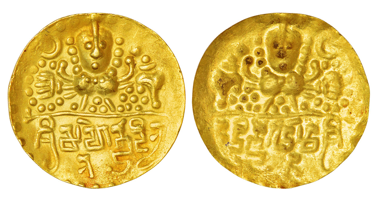 Gupta Empire - gold repousse coin/ bracteate of Kumara Gupta I (c.415-450 AD), 'Garuda' type, S. Kumar Class III (Pg. 383), variety G (RRR), 1.30g. Obv: Garuda with a beaded hairstyle, rounded body, sits on a curved branch, fly-whisk at left and Sankha at right, Brahmi legend Sri Mahendraditya below and letter 'Na' in exergue.