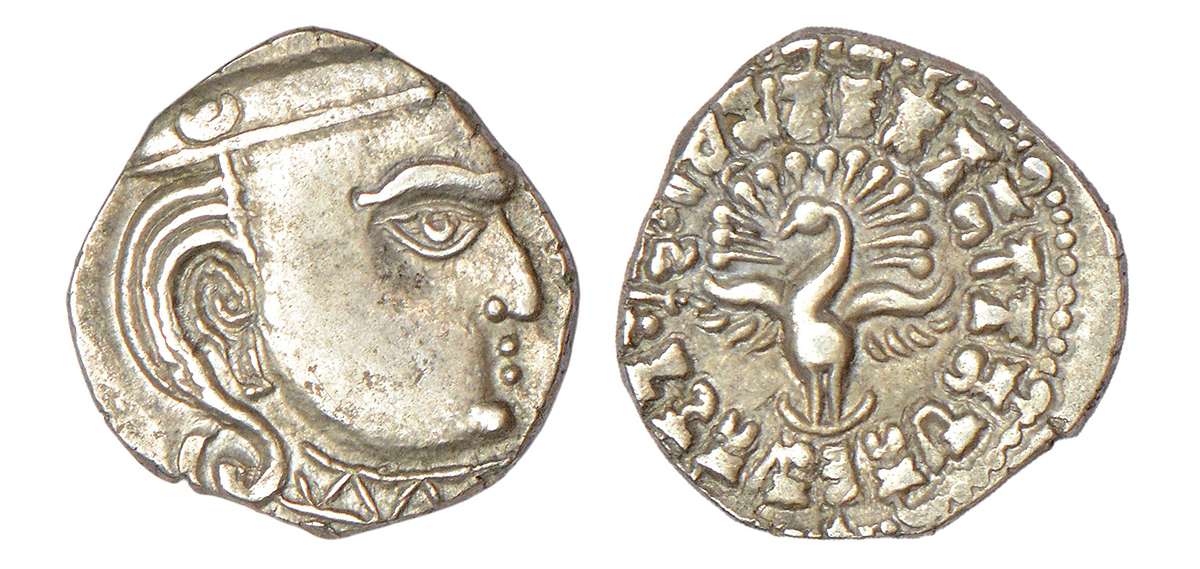 Gupta Empire - silver drachm of Skanda Gupta (c.450-475 AD), 'fan-tailed peacock' or 'Madhyadesha' type, Altekar Class IV, var. A, S. Kumar Var. A, 2.42g. Obv: Profile bust of king to right. Rev: fan-tailed peacock in center; Brahmi legend in Sanskrit around Vijitavaniravanipati Jayati Divam Skandaguptoyam around.