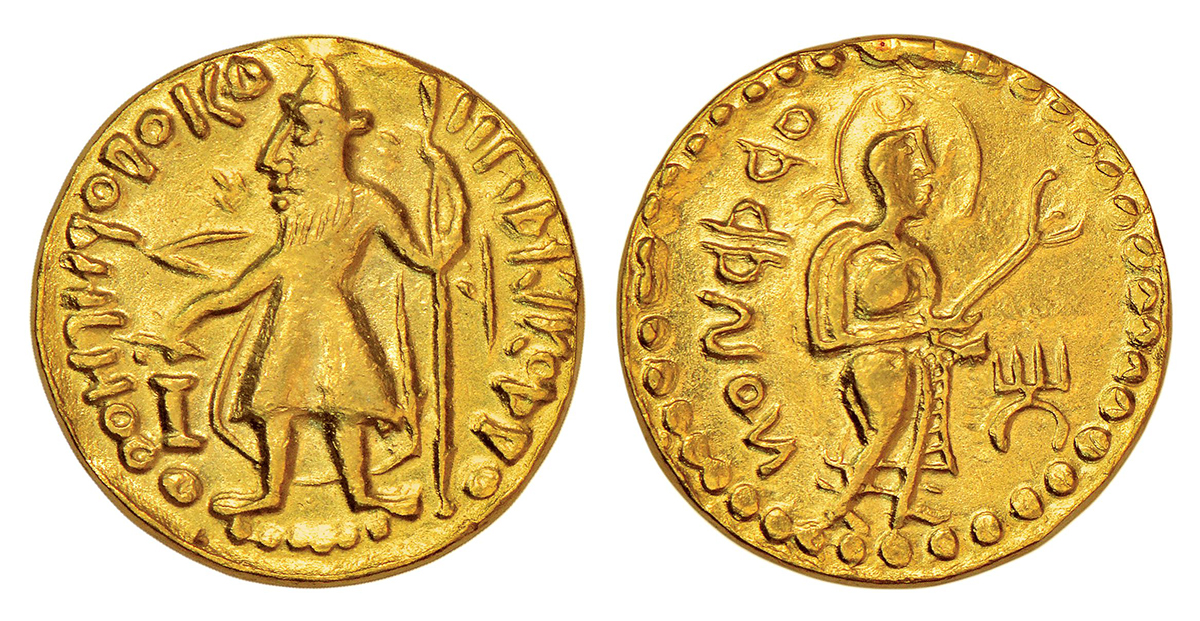Post Gupta coinage in Bengal, Samatata region - gold dinar imitating Kushan coin design (c.400-500 AD), ECB SAM1A.3, 7.49g. Obv: King wearing Kushan-style conical helmet and tunic, standing offering a sacrifice at an altar, holding a trident; Bactrian legend around. Rev: Goddess, holding a stylised cornucopia, inspired by the Kushan goddess 'Nana', facing right; degenerate Bactrian legend in the left field and a Tamgha-like symbol to right.