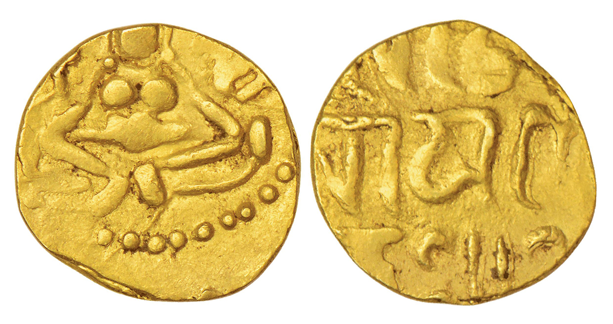 Medieval Central India - gold coinage inspired by the 'Gangeya Deva' coins of Tripuri, 4½ masha coin of Rajanarayana (c. 11-12th century AD), Deyel 'Lakshmi' 1.3, 4.12g. Obv: Goddess Lakshmi seated cross-legged, facing. Rev: Devanagari legend Sri Raja/Naraya /na Deva visible in parts in three lines.