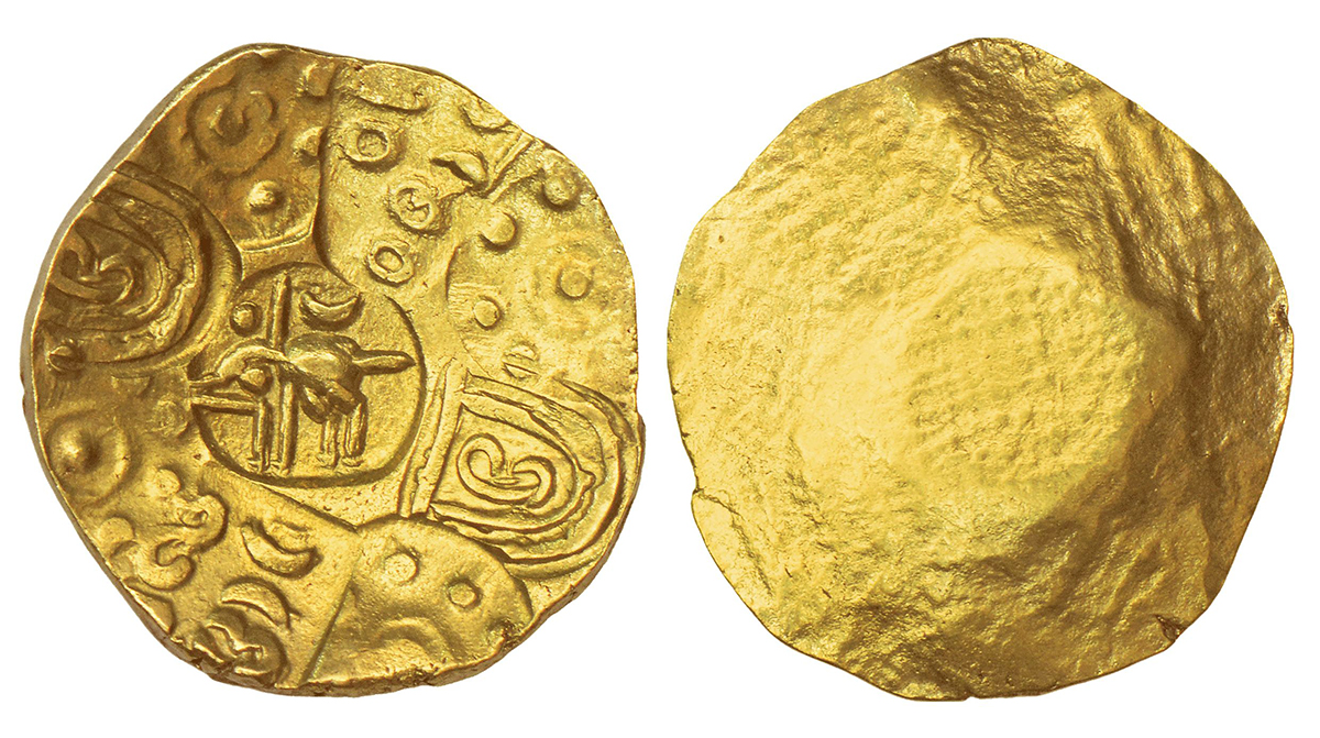 Kakatiyas of Warangal, punch-marked gold gadyana, in the name of 'Raya Gajakesari', attributed to Ganapati Deva (1199 -1259 AD), 3.57g. Obv: Nine punches - 1x Boar in centre, 2x Kannada letter “Sri”, 4x "Lotus" flower symbol, 1x Kannada legend Raya Gaja and 1x Kannada legend Kesari.