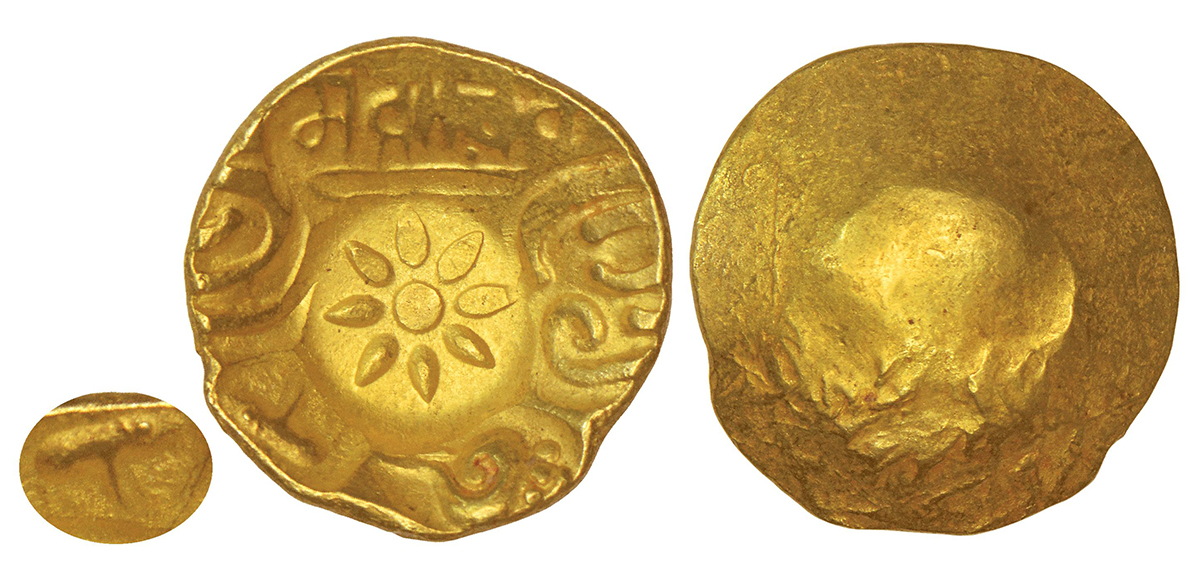 Yadavas of Devagiri, Mahadeva (1261-1270 AD), gold punch-marked Asu or 'Padma Tanka', Similar to MSCI-I no. 288, 3.82g. Obv: Six punches: 2x Kannada letter 'Shri', 1x Sankha shell, 1x Lotus in centre, 1x Boar to right & 1x Devanagari legend Mahadeva with a bow below.