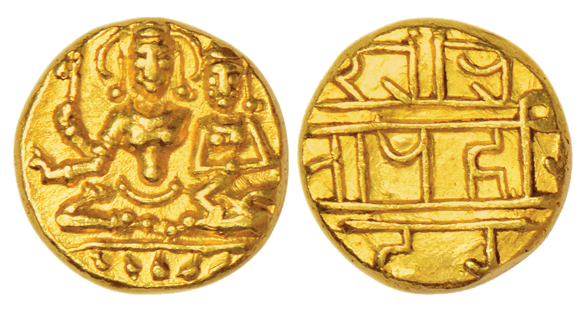 Vijayanagar Kingdom, Sangama dynasty, gold ½ pagoda of Hari Hara II (1377-1404 AD), MCSI-I 412-414, 1.70g. Obv: Shiva Parvati seated, Shiva holds trident and damru. Rev: Devanagari legend Sri Pra/thapa Hari/Hara in three lines.