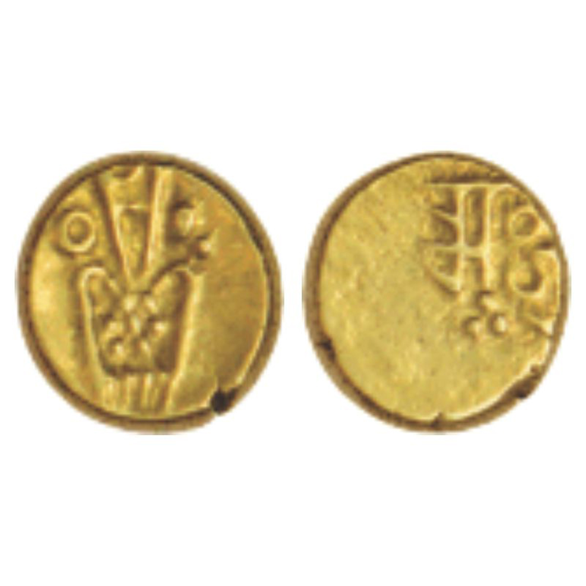 Nayakas of Jinji/Vellore region, gold fanam in the name of 'Ranga Raya', (c.1600-1700 AD), 0.39g. Obv: Stylized 'Kali’ design. Rev: Devanagari legend Rama Rau in two lines.