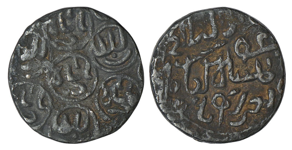 Sultans of Bengal, Silver tanka of Nasir al-Din Mahmud (1433-1459 AD), Dar al-Darb mint, 'Seven circle' type, G&G B471, AH 854, 10.03g. Obv: Arabic legend nasir shah in four circles (one in centre, three on periphery); al-sultan in three circles (all on periphery), circles separated by crescents along the margin. Rev: In lotus-shaped cartouche, Arabic legend nasir al-islam ghauth al-muslimin followed by date in numerals and mint name.