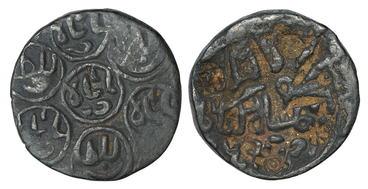 Sultans of Bengal, Silver tanka of Nasir al-Din Mahmud (1433-1459 AD), 'Seven circle' type, G&G B470/B471, 10.64g. Obv: Arabic legend nasir shah in four circles (one in centre, three on periphery); al-sultan in three circles (all on periphery), circles separated by crescents along the margin. Rev: In lotus-shaped cartouche, Arabic legend nasir al-islam ghauth al-muslimin.