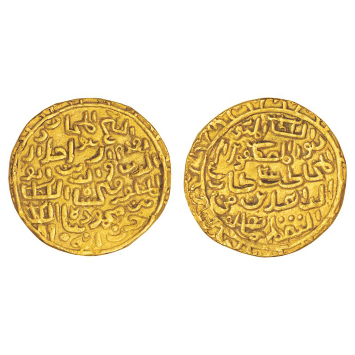 Sultans of Bengal, Gold tanka of Jalal al-Din Fath Shah (1481-1486 AD), with religious legends, Khazana mint, AH 890, G&G B625 (plate specimen), 10.51g. Obv: Arabic legend within a decorative border al-Shaykh al-Mujawar bi-Qadam al-Rasul [The Shaikh who is close to the Qadam Rasul] Jalal al-Dunya wa al-Din Abu al-Muzaffar Fateh Shah al-Sultan bin Mahmud Shah al-Sultan, followed by AH date in numbers. Rev: Arabic legend in a decorative border al-Sultan al-Munawwar bi-Noor al-Mustafawi al-Ilahi al-Mukhatib Sultan al-Zahideen fi al-Iqzzat al-Mushahidah [The sultan who is enlightened by the light of the chosen and the divine, who is entitled “Sultan of those who are devoted to vigils and contemplation].