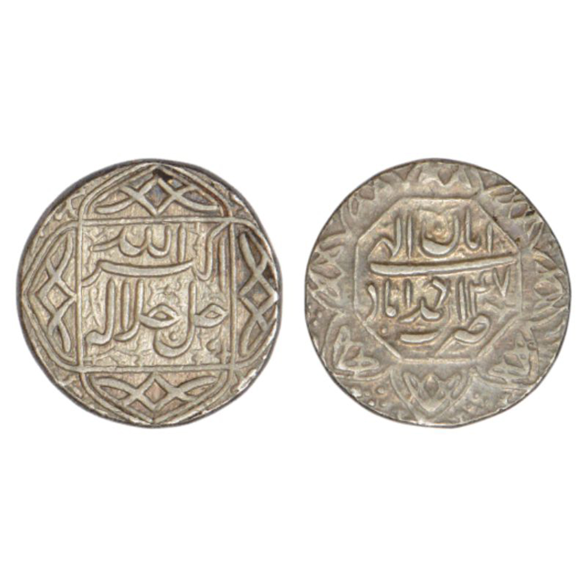 Akbar (1556-1605 AD), silver rupee, Ahmadabad mint, Aban, Ilahi 47, KM 94.2, 11.42g. Obv: Persian legend Jalla Jalalahu Allahu Akbar within 4-pointed star. Rev: Mint-name, Ilahi month and year within 8-pointed octagonal star.