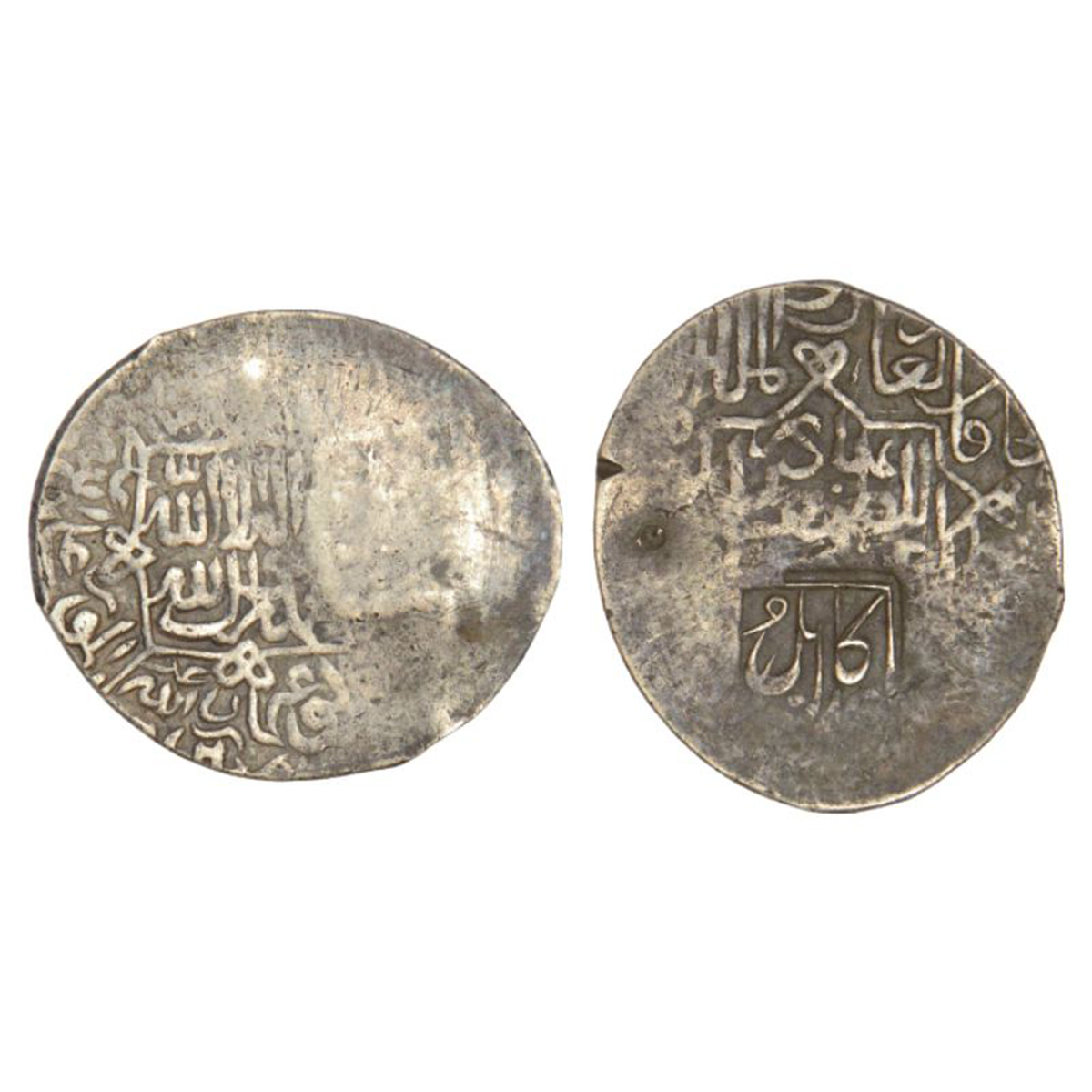 Akbar (1556-1605 AD), silver shahrukhi, Adl Kabul mint, counter-stamped on Shaybanid's Shahrukhi. Obv: The Kalima Shahada in rectangular cartouche frame, names and title of four caliphs in the margin. Rev: Arabic legend counter-stamped Adl Kabul within a mihrab-shaped cartouche, invocation khallada allah ta'ala mulkahu around.