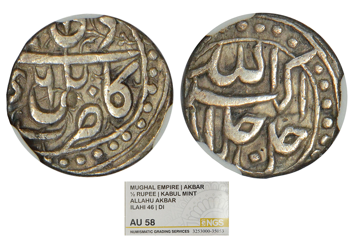 Akbar (1556-1605 AD), silver ½ rupee, Kabul mint, Di, Ilahi 46, KM 66.2.