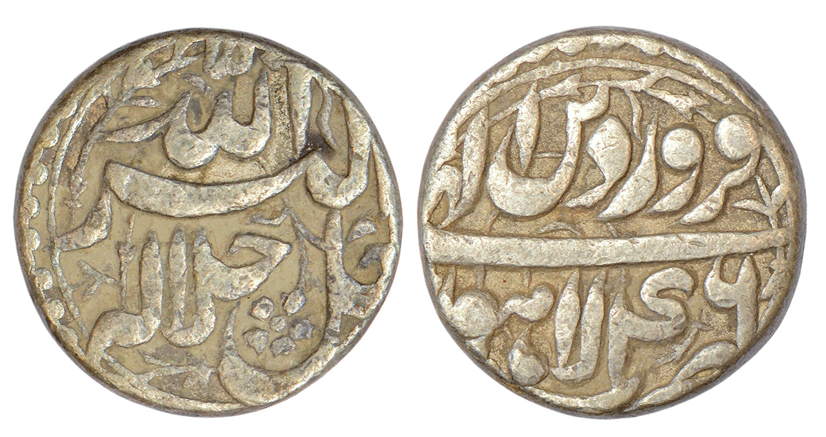 Akbar (1556-1605 AD), silver rupee, Lahore mint, Farwardin (first month), Ilahi 46, KM 93.11, 11.32g. Obv: Persian legend Jalla Jalalahu Allahu Akbar. Rev: Mint-name, Ilahi month and year.