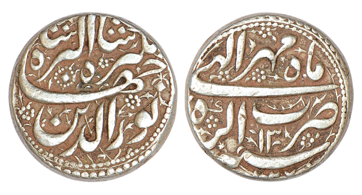 Jahangir (1605-1627 AD), silver rupee, Agra mint, 'Nur ud-din' type, Mihr, AH 1027/RY 13, KM 145.1, 11.32g. Obv: Persian legend noor ud-din jahangir shah akbar shah within a decorative dotted border. Rev: Mint-name, Ilahi month, date and RY.