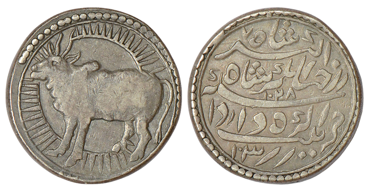 Jahangir (1605-1627 AD), silver fantasy token copying designs of a 'Zodiacal' rupee, Agra mint, 'Taurus' sign, AH 1028/RY 13, 11.28g. Obv: Zodiac sign of Taurus the Bull - Constellation of Tora/Vrishabha, standing facing left against a full sunburst. Rev: Farsi couplet with AH date and RY.