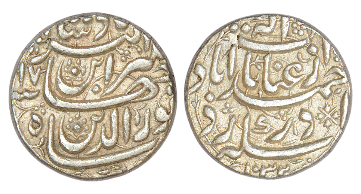 Jahangir (1605-1627 AD), silver rupee, Ahmadabad mint, 'Enayate Elah' couplet, AH 1032/RY 17, KM 149.4, 11.41g. Obv: Persian legend shahe noor ud-din jahangir ibn akbar badshah with RY. Rev: Persian legend sikka zad dar ahmadabad az enayate elah with AH date.