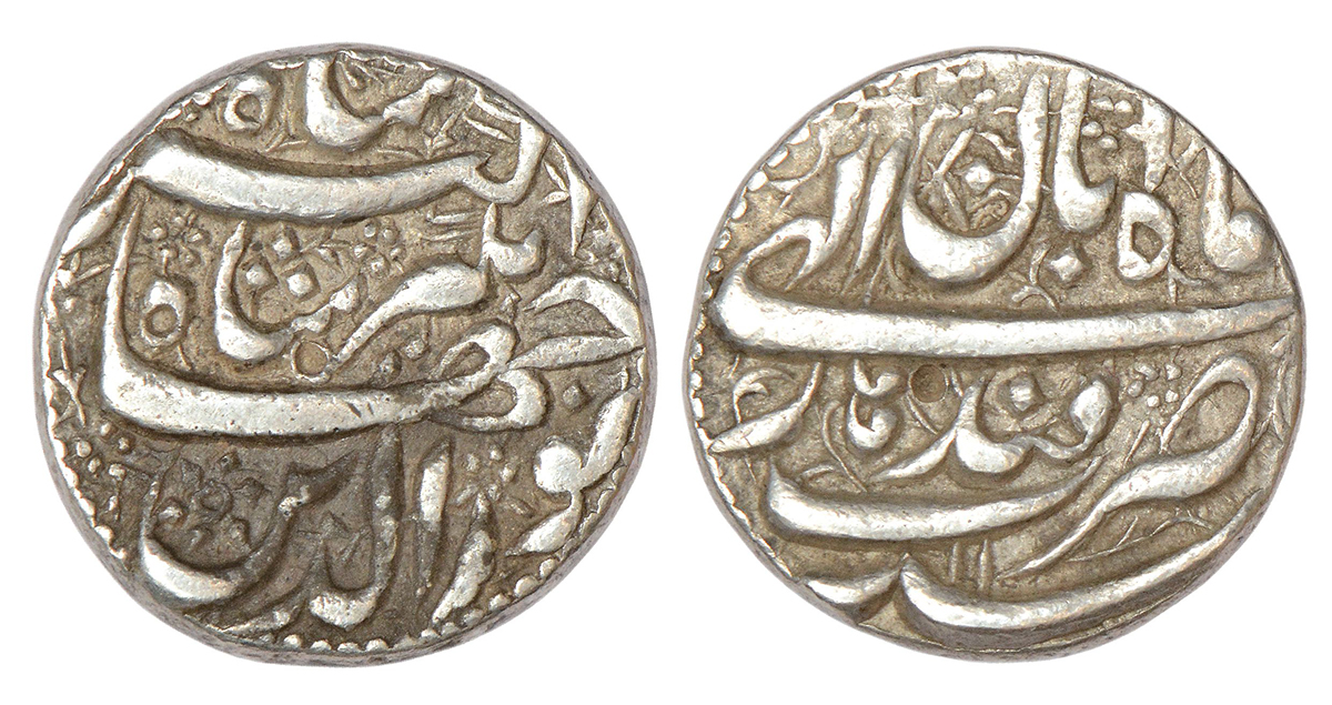 Jahangir (1605-1627 AD), silver rupee, Qandhar mint, Aban, RY 11, 'Nur ud-din' type, KM 145.13, 11.44g. Obv: Persian legend noor ud-din jahangir shah akbar shah within a decorative dotted border. Rev: Mint-name, Ilahi month and RY.