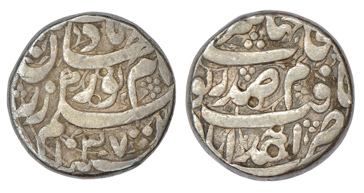 Jahangir with the name of Noor Jahan (1623-1627 AD), silver rupee, Ahmadabad mint, 'Sad Zewar' couplet, AH 1037/RY 2x, KM 168.2, 10.92g. Obv: Farsi hemistich za naame noorjahan badshah begam zar with AH and RY date. Rev: Farsi hemistich ba-hukm-i shah jahangir yaft sad zewar with mint-name at bottom.