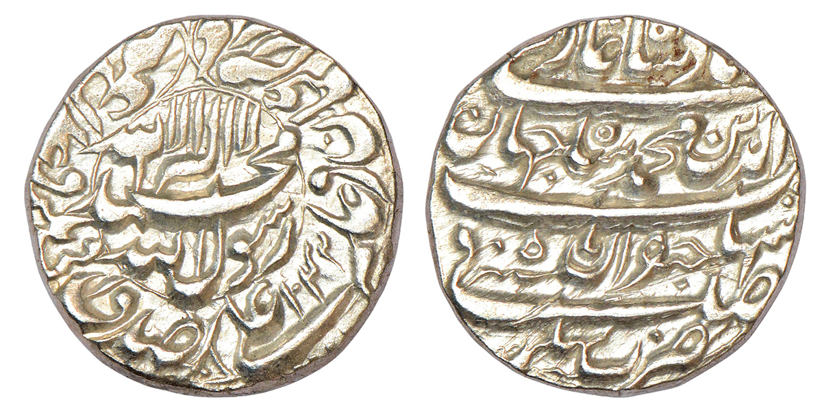 Shah Jahan (1628-1658 AD), silver rupee, Bhilsa mint in left quadrant, 'square areas' type, RY 4, K...