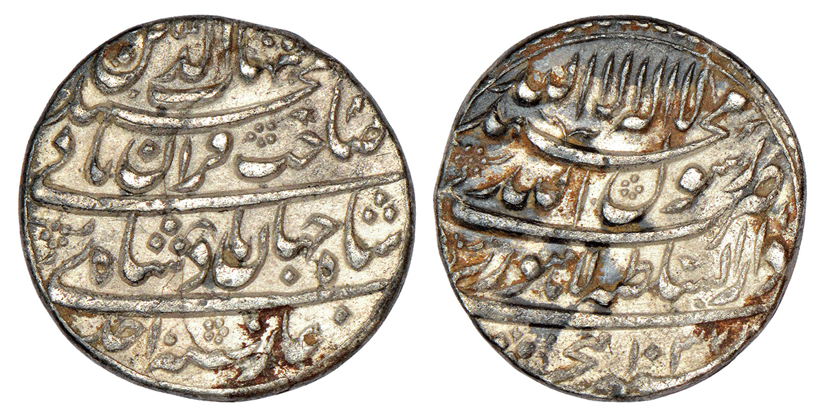 Shah Jahan (1628-1658 AD), silver rupee, Dar us-Sultanat Lahore mint, AH 1037/RY Ahd, both sides legend in four lines, KM 222.10, 11.37g. Obv: Emperor's full name and title shihab ud-din muhammad shahjahan badshah ghazi sahib-e-qiran sani with RY. Rev: The Kalima Shahada with mint-name and epithet, and AH date.