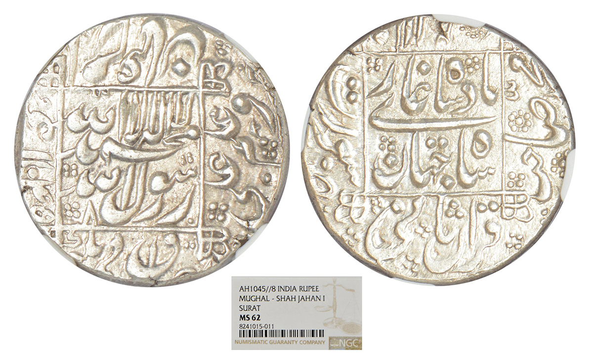 Shah Jahan (1628-1658 AD), silver rupee, 'square areas' type, Surat mint in left quadrant, AH 1045/RY 8, KM 235.23. Obv: The Kalima Shahada and RY date within square; names of four caliphs with their titles in margin with AH date. Rev: Persian legend shahjahan badshah ghazi within square; ruler's title shihab ud-din muhammad sahib-e-qiran sani with mint -name in quadrants.