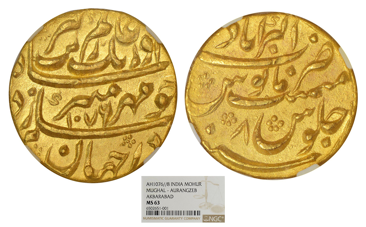 Aurangzeb (1658-1707 AD), gold mohur, Akbarabad mint at top, 'Mihr-e-munir' couplet, AH 1076/RY 8, KM 315.5. Obv: Persian legend sikka zad dar jahan chu mehre munir shah aurangzeb alamgir with AH date. Rev: Mint-name, RY and Jalus formula.
