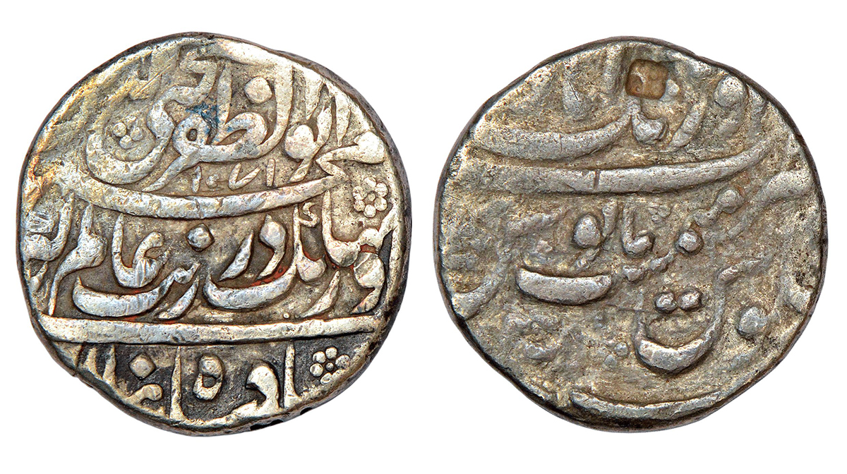 Aurangzeb (1658-1707 AD), silver rupee, Islamabad mint at bottom, 'Badar-e-munir' couplet, AH 1106/...