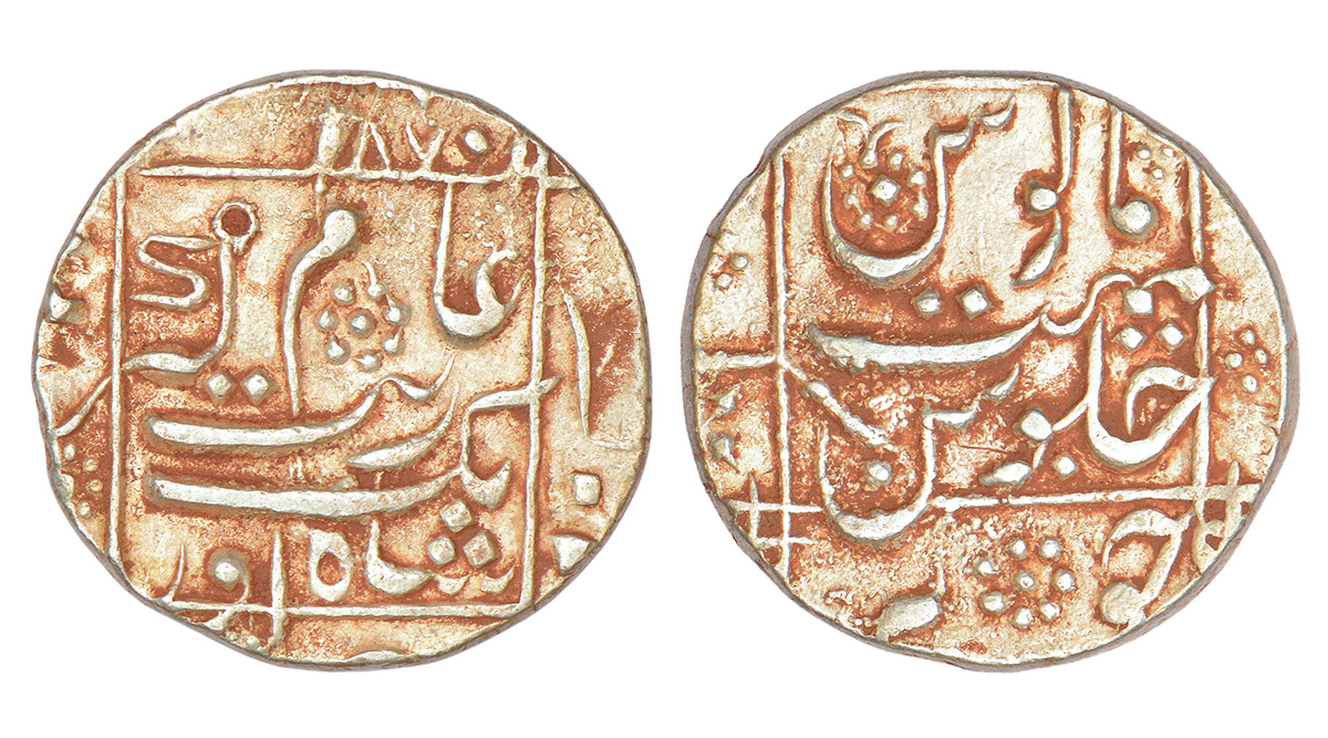 Aurangzeb (1658-1707 AD), silver rupee, Junagadh mint in bottom quadrant, 'square areas' type, AH 1087, KM 301.2.