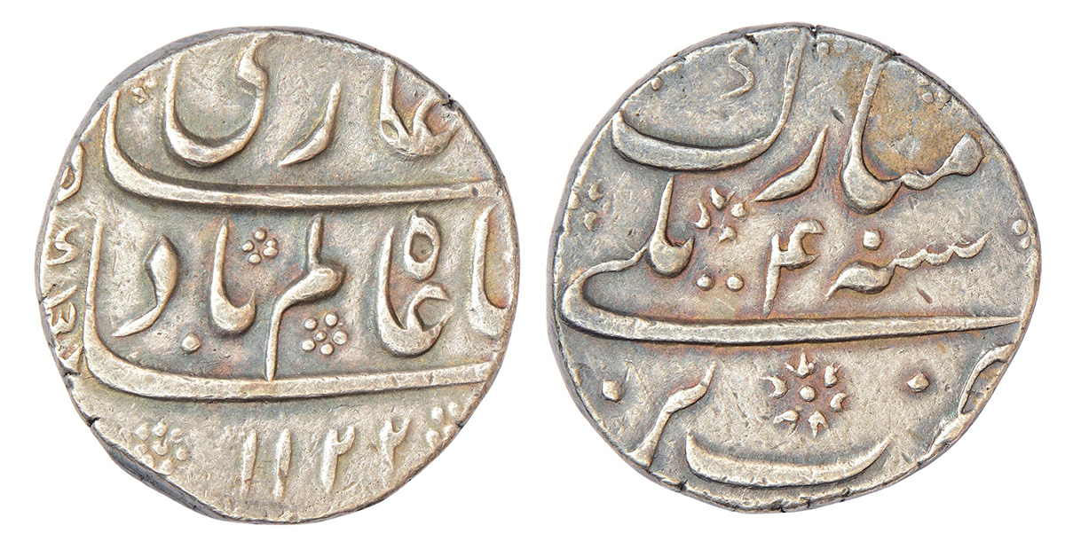 Shah Alam Bahadur (1707-1712 AD), silver heavy weight rupee, Azimabad mint, AH 1123/RY 5, similar t...