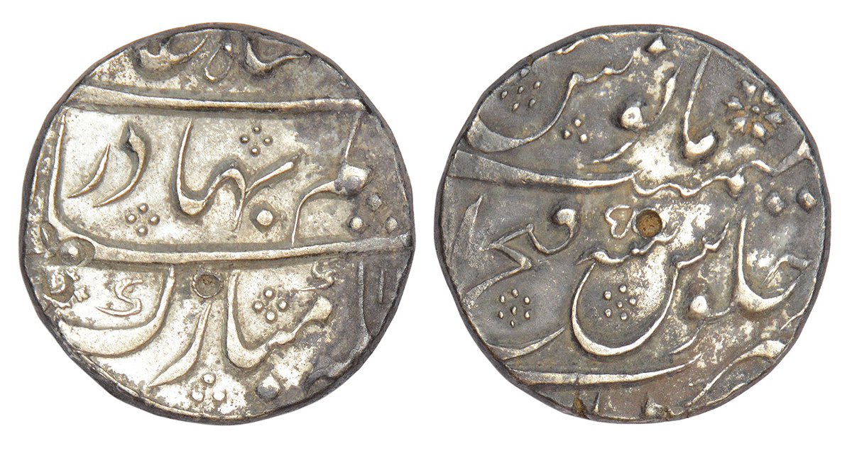 Shah Alam Bahadur (1707-1712 AD), silver rupee, Fathabad Dharur mint, RY 5, unlisted in KM and other standard references, 11.44g.