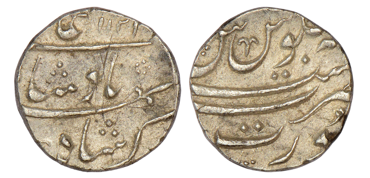 Shah Alam Bahadur (1707-1712 AD), silver rupee, Peshawar mint (fully visible), AH (1)119/RY 2, with...
