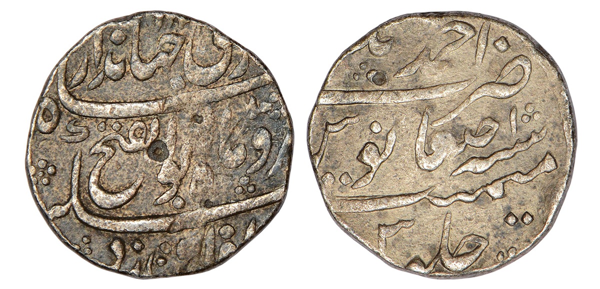 Jahandar Shah (1712-1713 AD), silver rupee, Bareli mint, 'Sahib Qiran' couplet, AH 1124/RY Ahd, KM ...
