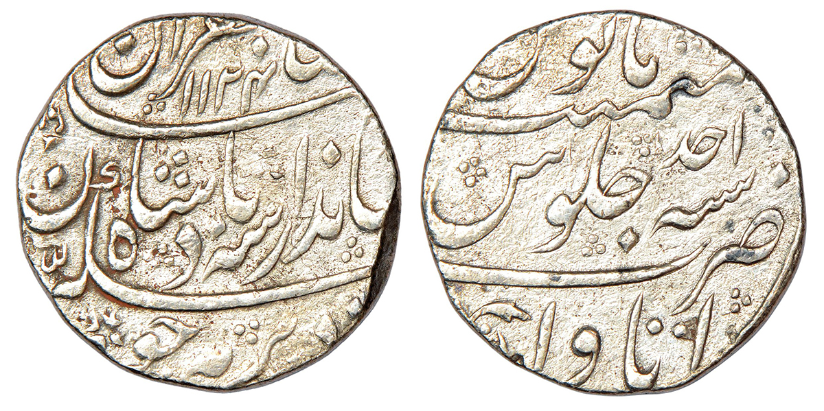 Jahandar Shah (1712-1713 AD), silver rupee, Bareli mint, 'Sahib Qiran' couplet, AH 1124/RY Ahd, KM ...