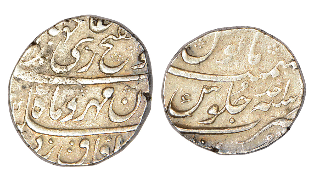 Jahandar Shah (1712-1713 AD), silver rupee, Dar ul-fath Ujjain mint, 'Abu al-Fath' couplet, AH 1124...