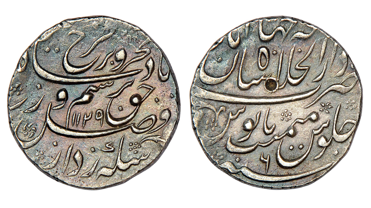 Farrukhsiyar (1713-1719 AD), silver rupee, Dar ul-Khilafat Shahjahanabad mint, 'Bahr-o-Bar' couplet, AH 1129/RY 6, KM 377.55, 11.37g.