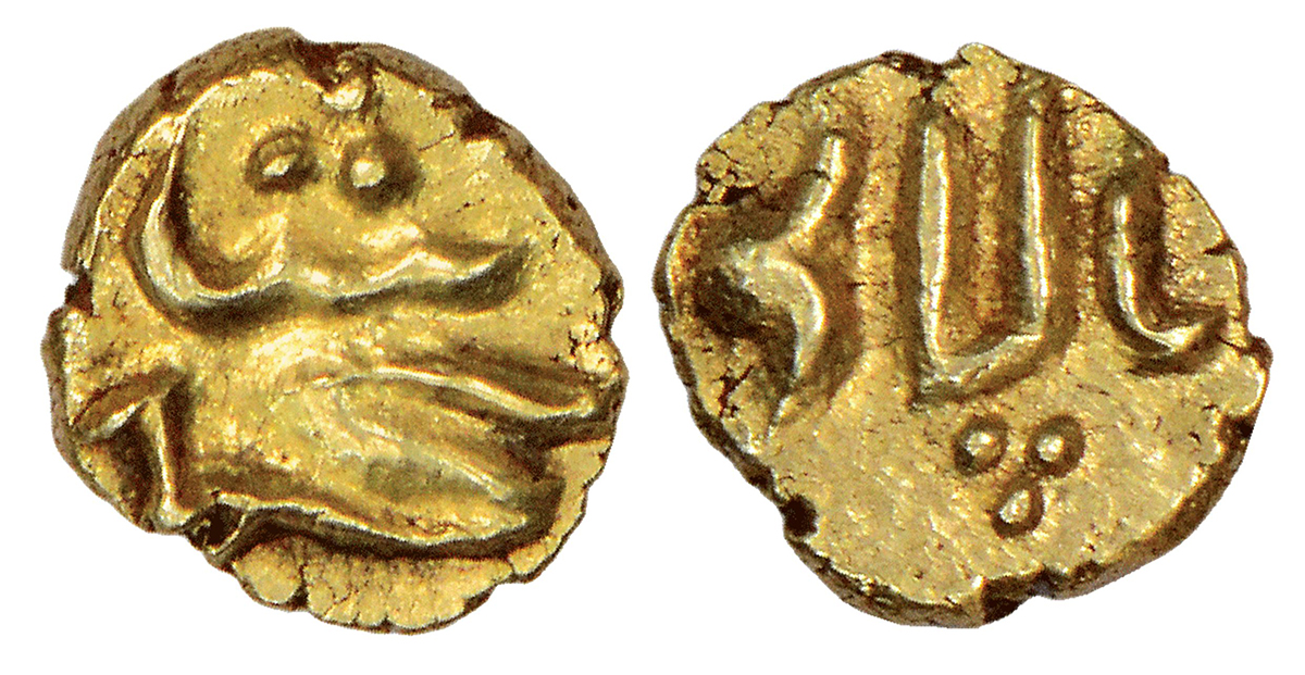 Muhammad Shah (1719-1748 AD), gold fanam, Balapur mint, ruler's name on obverse and mint-name on reverse clearly visible, KM C440.2, 0.36g.