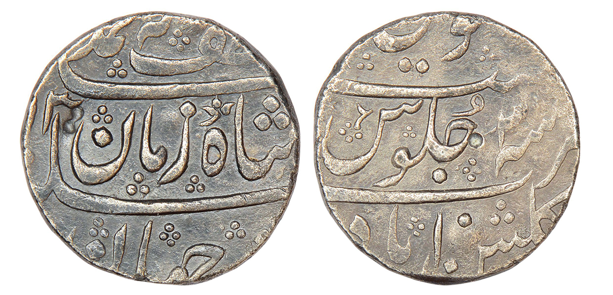 Muhammad Shah (1719-1748 AD), silver rupee, Gulshanabad (Nashik) mint (fully visible), 'Ba-Luft Elah Badshah-i-Zaman' couplet, RY 3, KM 434.2, 11.20g. Obv: Persian legend sikka zad dar jahan ba-lutf elah badshah-i-zaman muhammad shah and AH date. Rev: Mint name at bottom, RY and Jalus formula.