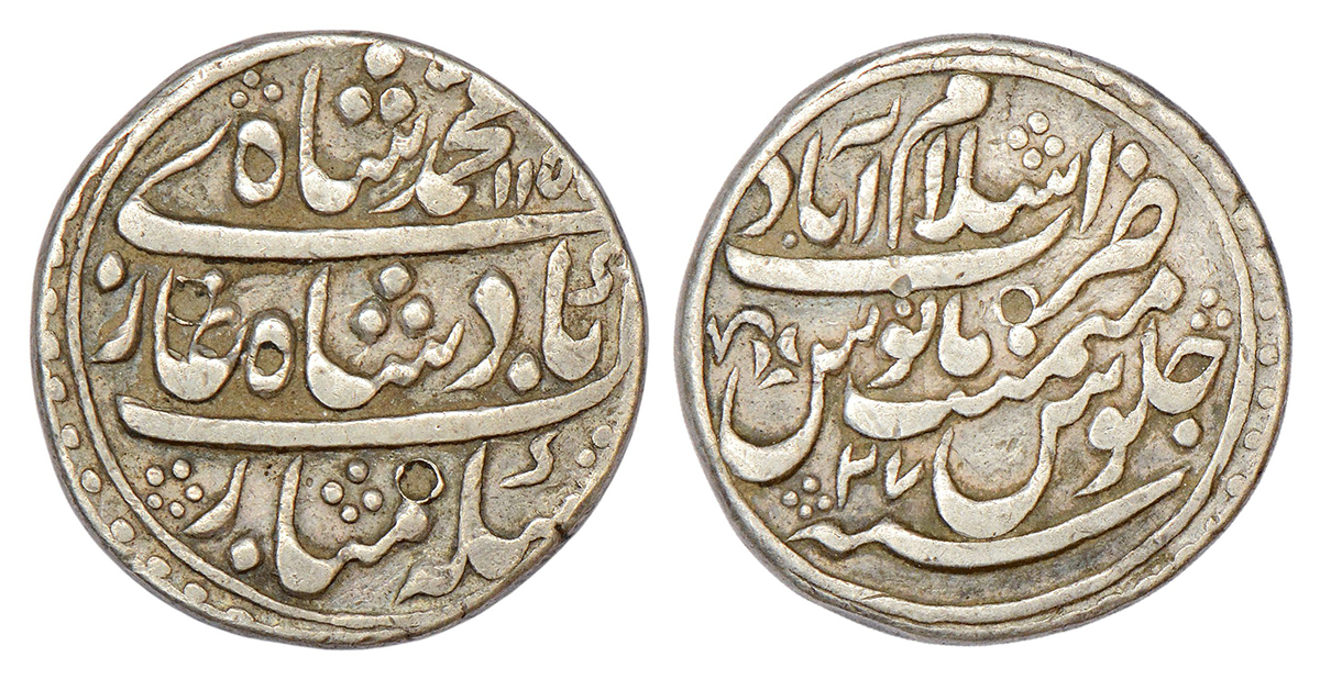Muhammad Shah (1719-1748 AD), silver rupee, Gulshanabad (Nashik) mint (fully visible), 'Ba-Luft Ela...