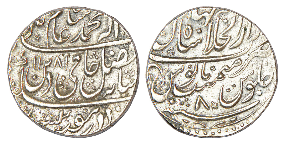 Mughal Potentates, local Zamindar issue, silver rupee, Hathras mint at top, in the name of Shah Ala...